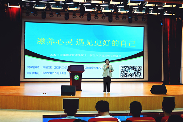在心理健康讲堂上,高富玉老师向同学们阐述了青春期人群在心理健康和生理健康方面的关系,深层次地分析大学生心理健康标准,通过心理测试实验说明情绪变化对身体健康的影响,介绍了大学生常见的心理问题,提出与人分享快乐、换位思考、树立目标等方法以适应全新的大学生活。讲座上,她邀请各组的同学们上台,通过参与“快乐抓乌龟”等拓展互动游戏,同学们在互动游戏过程中心理压力得到有效的释放,她同时建议同学们可以通过阅读心理健康的相关书籍,帮助自己有意识地培养积极成长、乐观向上的人生态度。