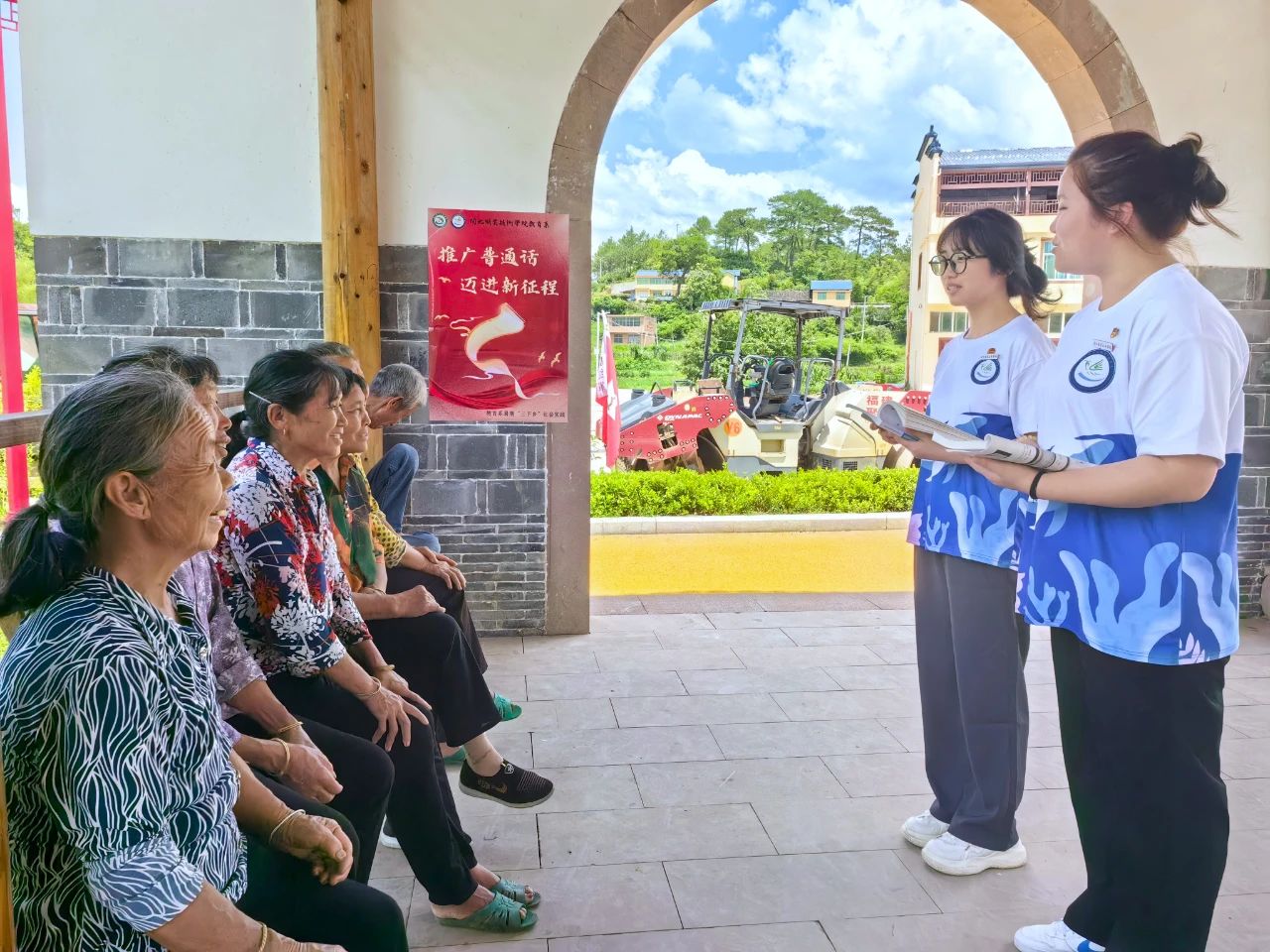 在安乐镇各村,队员们与村民沟通交流,初步了解当地普通话普及、掌握情况。针对村民发音不标准、运用不熟练等问题,实践队员以集中教学的方式开展训练。在轻松愉悦的氛围中,当地村民也感受到普通话的魅力。