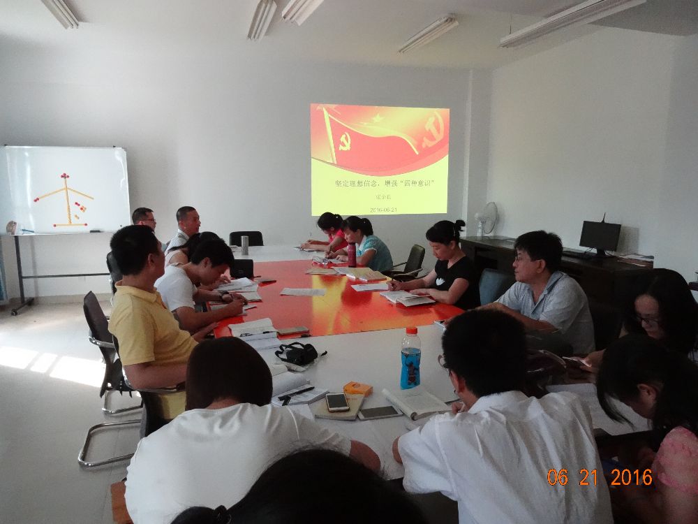 2016年6月21日下午,食品与生物工程系第一党支部全体党员在行政楼409召开了“两学一做”学习教育第一专题研讨会。本次学习研讨的主题是:坚定理想信念、增强“四种意识”。会前,全体党员认真研读《中国共产党章程》、《中国共产党廉洁自律准则》、《中国共产党纪律处分条例》、《习近平总书记系列重要讲话读本(2016年版)》等书目,并做好学习笔记。会议分为两阶段。第一阶段为交流研讨,会上,党支部书记鞠璐宁作重点发言,其他党员互动交流。第二阶段听系主任、系党总支副书记张金良上党课。张金良同志上了一堂“坚定理想信念,增强四种意识”的党课。党课内容丰富,结合学习和工作实际,讲得深入浅出,生动活泼,使党员们受益匪浅。通过第一专题的学习研讨,全体党员进一步坚定了理想信念,增强了政治意识、大局意识、核心意识、看齐意识。