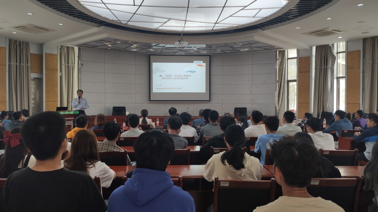 10月20日中午,信息系软件学院特邀Oracle全球职业教育项目中国区高级总监、资深Java架构师、东南大学计算机应用技术方向硕士王小志先生为信息系计算机应用技术、软件技术专业的部分学生进行了“AI、大数据、区块链与IoT整体架构与应用场景举例”讲解。莅临讲座的有学院党委书记谢友平、副院长郑需勇及福州安博榕信息科技有限公司常务副总经理陈黎黎等。