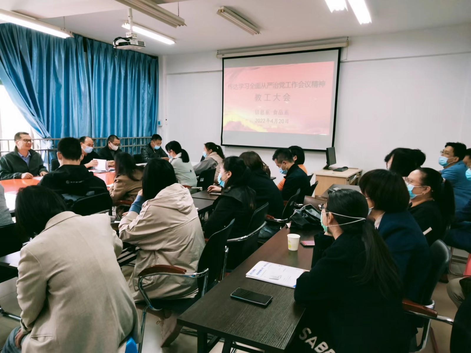 4月20日下午,信息系和食品系联合党总支在行政楼407会议室召开教工大会,传达学习上级全面从严治党工作会议精神,会议由系党总支书记郑启阶主持,两系教职工参加了会议。