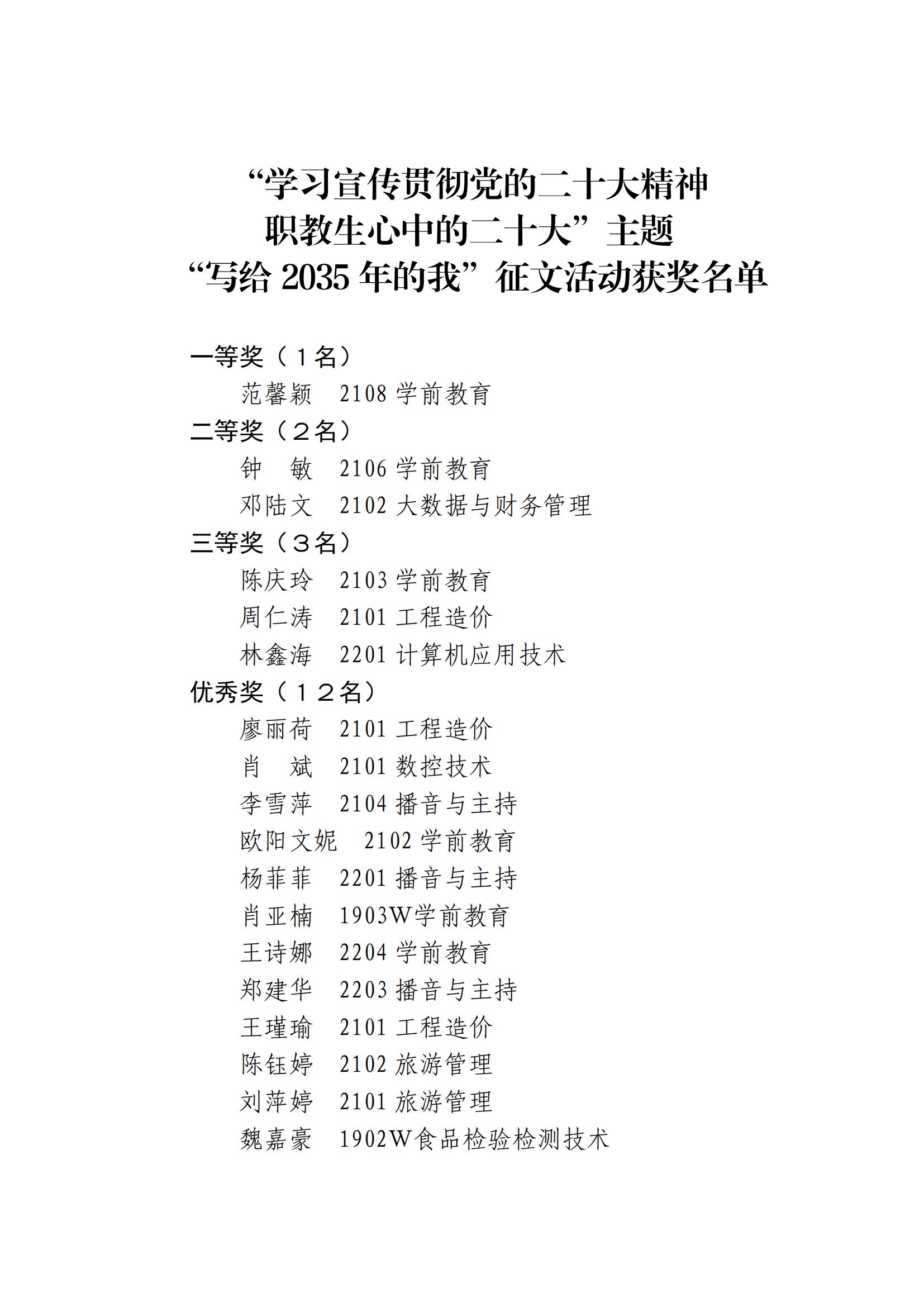 关于公布“学习宣传贯彻党的二十大精神 职教生心中的二十大”主题“写给2035年的我”征文活动获奖名单的通知